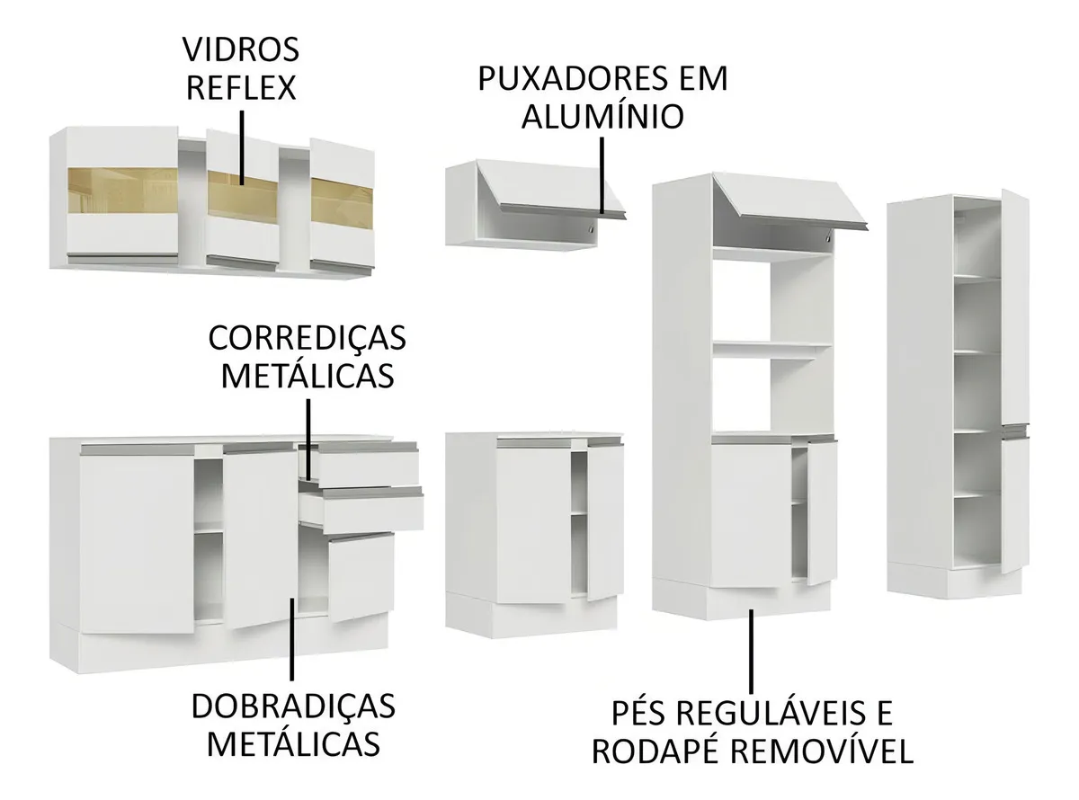 Fabricado 100% em MDF, o móvel é ecologicamente correto e extremamente durável, com puxadores em alumínio, corrediças e dobradiças metálicas e pés reguláveis em PVC. O rodapé removível em MDF facilita a limpeza.