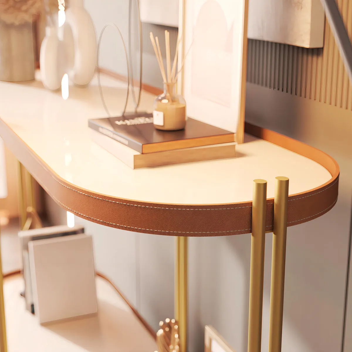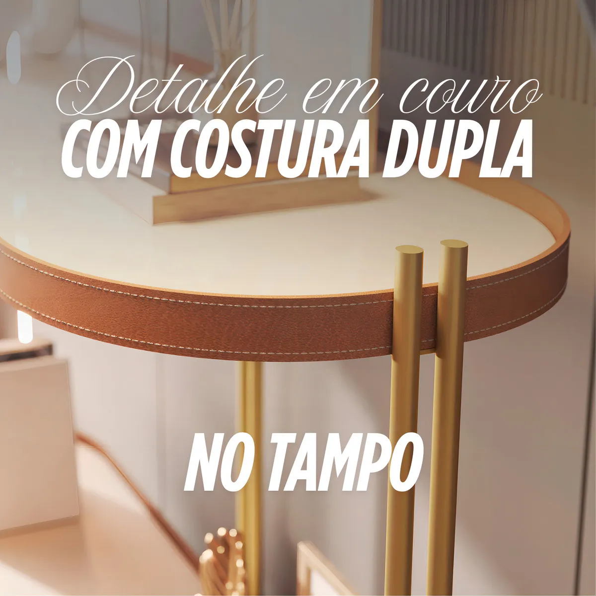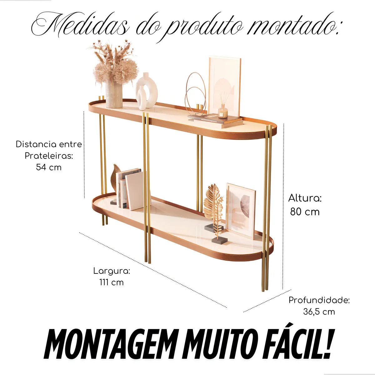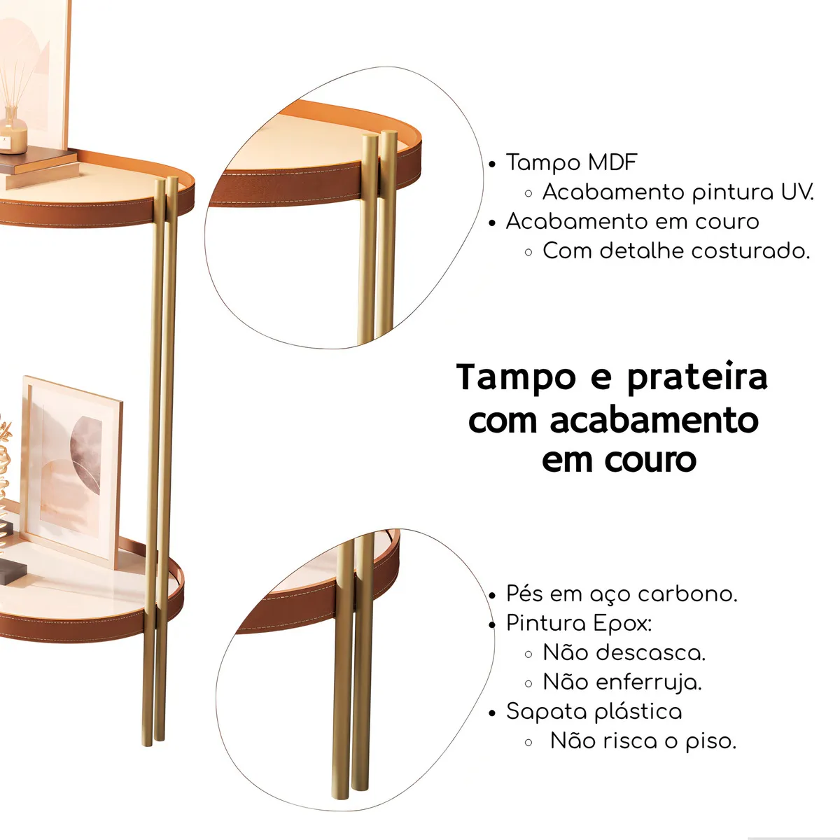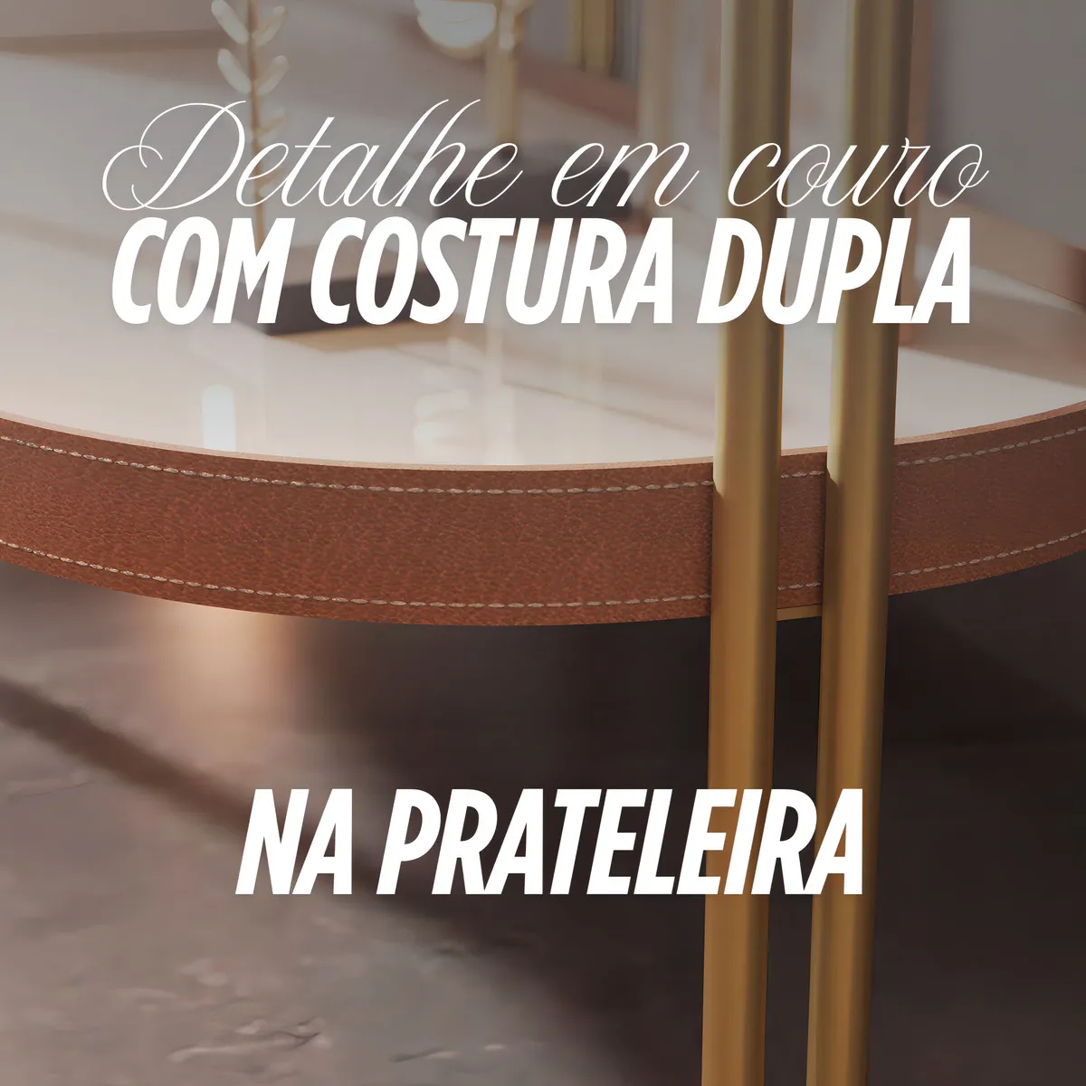 – Prateleiras em MDF com acabamento arredondado, revestidas com detalhe em couro com costura dupla