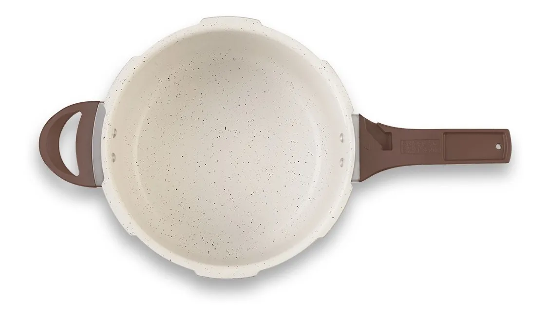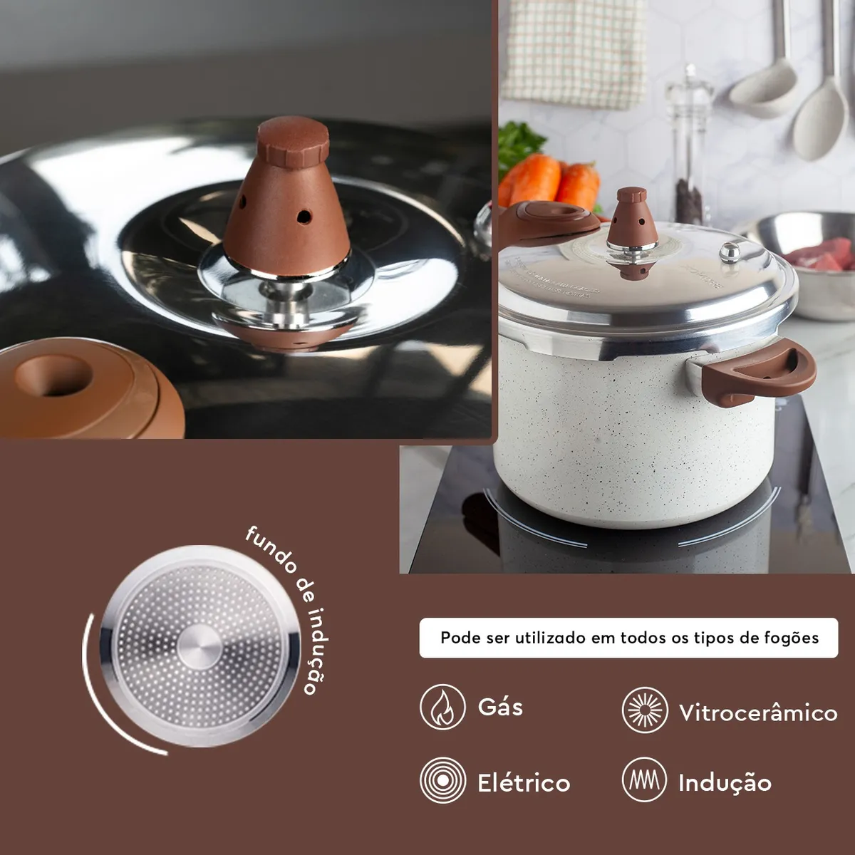 Com fundo de indução exclusivo, esta panela de pressão é compatível com todos os tipos de fogões, permitindo maior flexibilidade na cozinha.